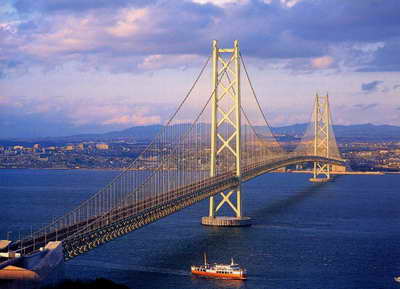 描述:明石海峡大桥也叫珍珠桥,是世界上最长的吊桥,中央高度有6532英尺,比之前的记录长了四分之一。珍珠桥开通于1998年,连接了日本的本州岛和淡路。