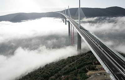 描述:米洛高架桥开放于2004年,位于法国南部,是世界上最高的行车桥,在空中900英里处。其外形就像一个帆船,帆船的桅杆高1125英尺,比艾菲尔铁塔都高。