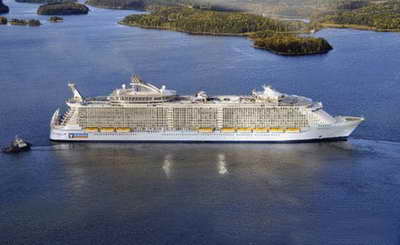 描述:皇家加勒比国际的海洋绿洲于2009年面世,是世界上最大的游轮,总重量是泰坦尼克号的5倍,长度是美国国会大厦的1.5倍,有16个甲板,可容纳6296个游客。